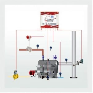 Buhar Kazan Dairesi Kontrol Sistemi , buhar kazanını özel güvenlik ve verimlilik gereksinimlerine göre çalıştırmak için gerekli tüm işlevleri sağlar. Kazanın işletme durumları, çalışma verileri ve ölçülen değerler dokunmatik ekrandan görüntülenebilir.